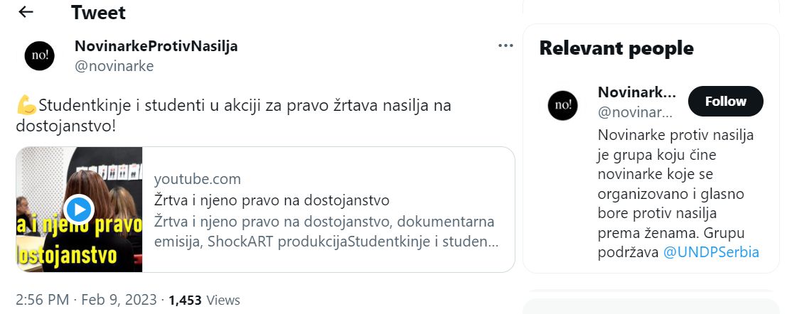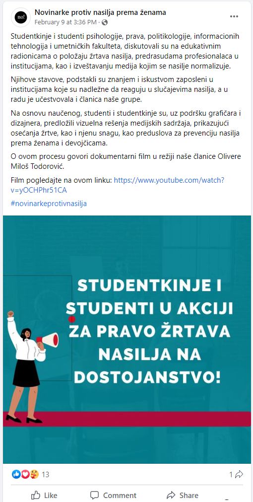 Анализом медијског извештавања о проблему насиља према женама у периоду од 2019. до 2021. године, Група „Новинарке против насиља према женама“ анализирала је 36000 објава. Главни закључци анализе показују да је у претходне три године смањен број медијских објава у којима нису поштовани етички стандарди извештавања о насиљу према женама, као и коришћење сензационалистичких и стереотипних израза за насиље, жртву или насилника, али медији и даље врло ретко извештавају о превенцији насиља и начинима подршке жртвама.